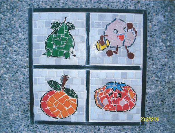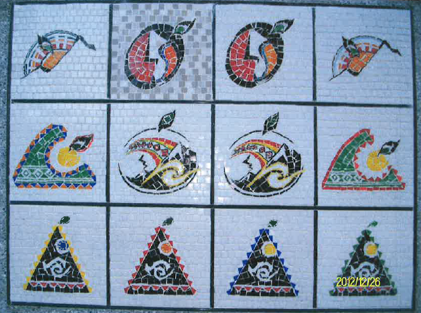 創作說明:將學生製作的馬賽克校徽,作為梨山國中小的學校精神,並鑲嵌於教職員宿舍牆壁,作為紀念。