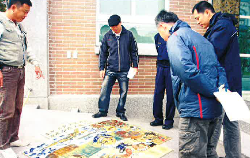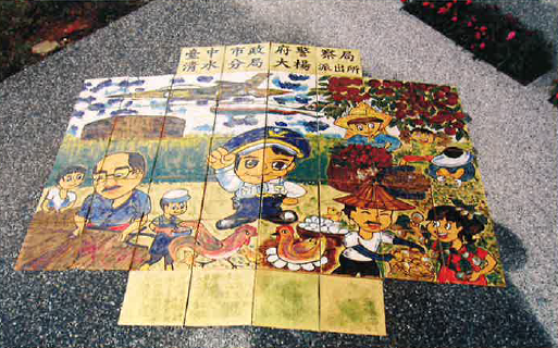 創作說明:將大楊派出所轄內人文風情,如製香業、地瓜園、花生園、養雞農戶、大楊油庫、荔枝果園、機場各式民航客機、軍機等逐一呈現。並由藝術家手繪成全開水彩大圖,結合陶板創作,鑲嵌於地磚上。