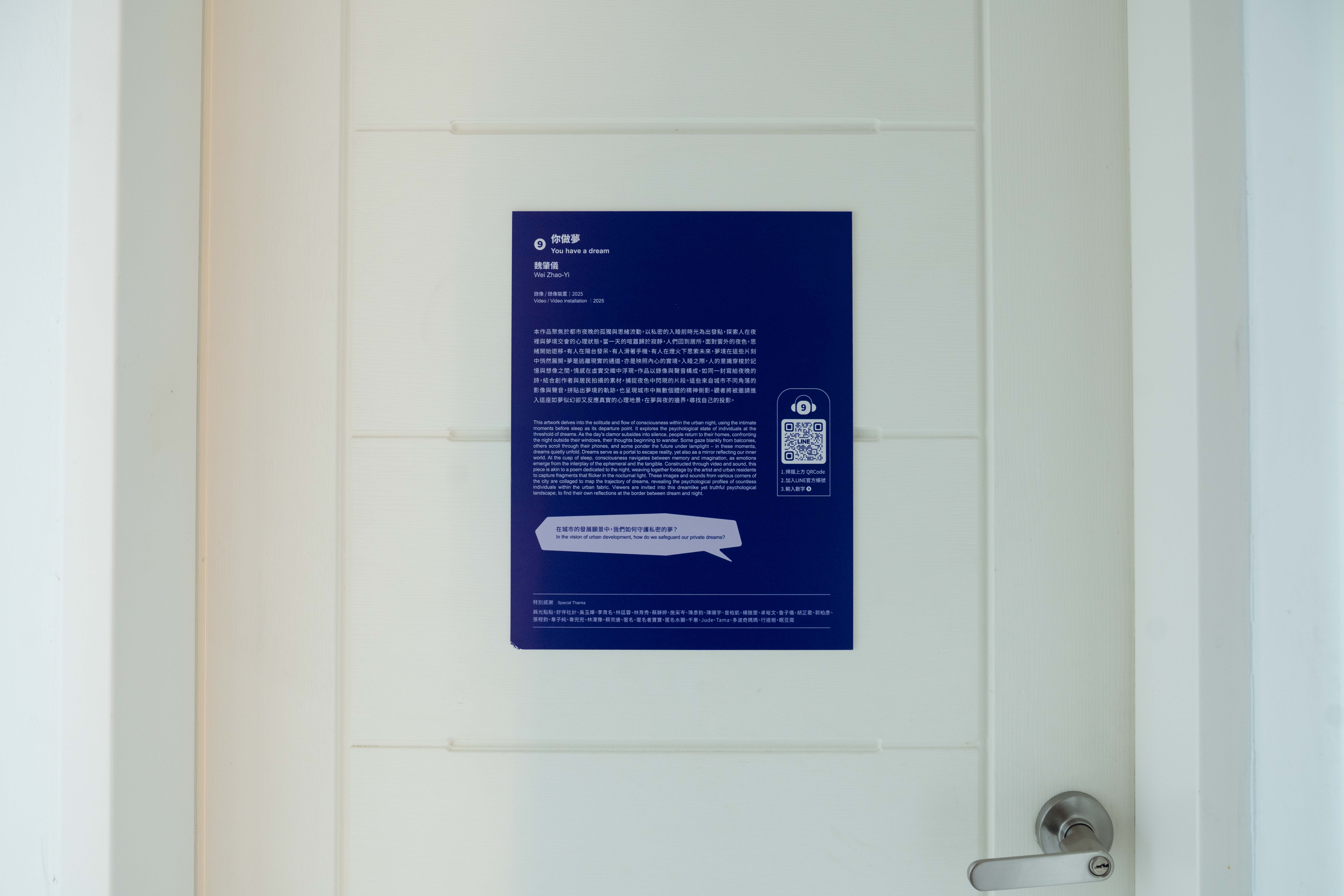 - 本作品聚焦於都市夜晚的孤獨與思緒流動,以私密的入睡前時光為出發點,探索人在夜裡與夢境交會的心理狀態。當一天的喧囂歸於寂靜,人們回到居所,面對窗外的夜色,思緒開始遊移。有人在陽台發呆、有人滑著手機、有人在燈火下思索未來,夢境在這些片刻中悄然展開。夢是逃離現實的通道,亦是映照內心的實境。入睡之際,人的意識穿梭於記憶與想像之間,情感在虛實交織中浮現。作品以錄像與聲音構成,如同一封寫給夜晚的詩,結合創作者與居民拍攝的素材,捕捉夜色中閃現的片段。這些來自城市不同角落的影像與聲音,拼貼出夢境的軌跡,也呈現城市中無數個體的精神側影。觀者被邀請進入這座如夢似幻卻又反應真實的心理地景,在夢與夜的邊界,尋找自己的投影。