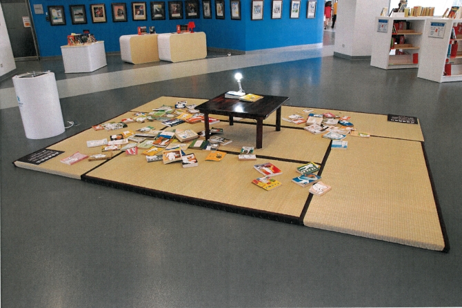 - 新銳藝術家許哲瑜,擅長取材傳媒訊息資訊,並藉由細膩、趣味的插畫人物,以故事性的敘事方式為觀者重新擬仿一個景觀現實。這次,他蒐集100本回收舊書,融合書本內容繪製成特色藝術書,並搭配日常不同屬性的生活物件,於圖書館內打造一個異於平常的閱讀空間,邀請民眾入座閱讀。在看似平常的展示之中,百本藝術書以意想不到的閱讀姿態、情境和書本進行對話,具有劇場化的敘事風格及細膩而抽離寫實的線條,勾勒出人物的動態劇情,吸引民眾在各種幽默的閱讀姿態下,莞爾一笑,展開一趟的想像力的閱讀旅程。