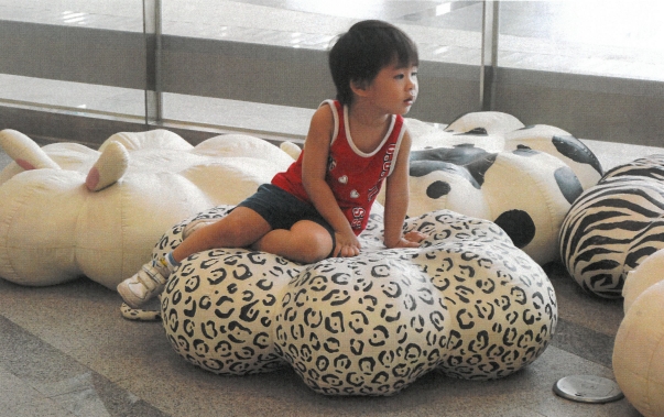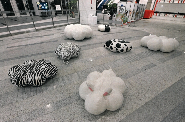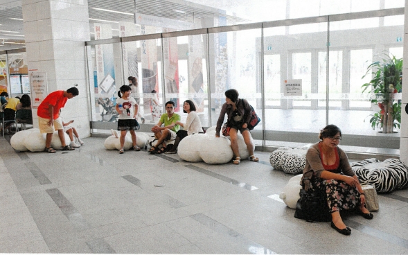 - 擁有詼諧童趣性格的藝術家崔永嬿,透過軟性填充材質,打造各式如甜甜圈造型般的雲朵座具,雲朵之上繪有各種動物生動活潑的童趣形象,組件式置放於服務台供民眾自行借乘,民眾可透過領取號碼牌的機制,自由搬移可愛雲朵,在圖書館內找尋喜愛的閱讀地點。共計六組被不同使用者,在館內不同區域使用坐乘,從分散最後聚集,逐一組成大片層疊相連的軟綿雲海,將天空中朵朵軟綿、輕盈的雲朵帶到民眾身邊,象徵著閱讀開啟人們無邊無盡的想像力,並以親切的姿態邀請民眾入座享受輕鬆、舒適且自由的閱讀時光。