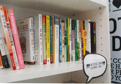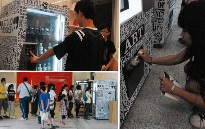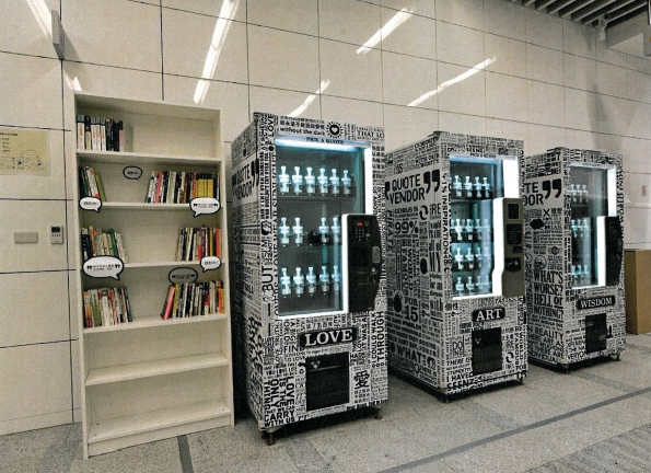 - 擁有知名設計師暨藝術家身分的王艾莉,以幽默且具社會意象的創作語彙提出《句子販賣機》,計畫於館內設置特殊的販賣機具,裡面裝的不是飲料零食,而是擷取於書本中的動人文字!艾莉蒐集了大家生活經驗中富含意義的經典文句或詩篇,精心打造出三台藝術販賣機,邀請大家獲得屬於自己的動人文句,按圖索驥索引出文句的出處書籍,誘發讀者更多閱讀知識的可能。