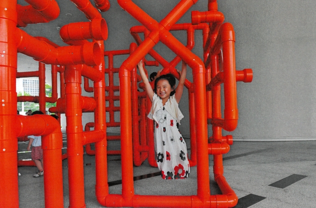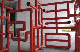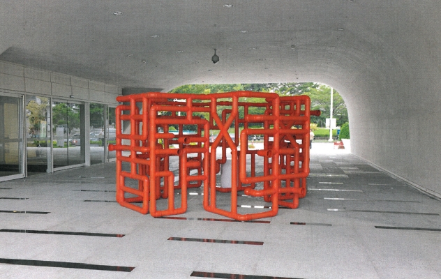 - 藝術家蔡坤霖擅長運用築材料「塑膠水管」為主要創作媒材,此次透過水管的繞曲延展,形成由篆書漢字組構而成一個「+」號結構造型體,民眾不僅可在彎曲的造型中「讀」到的「漢字」的樂趣,作品立體的空間量體更可讓民眾穿梭在作品之中。以景觀的方式將聲音收入其中,邀請民眾透過穿梭遊走的行為動作中參與發聲與聆聽,在這一個融合視覺、觸覺與聽覺感官經驗的互動平台上•來一場獨特的遊趣、閱讀體驗。