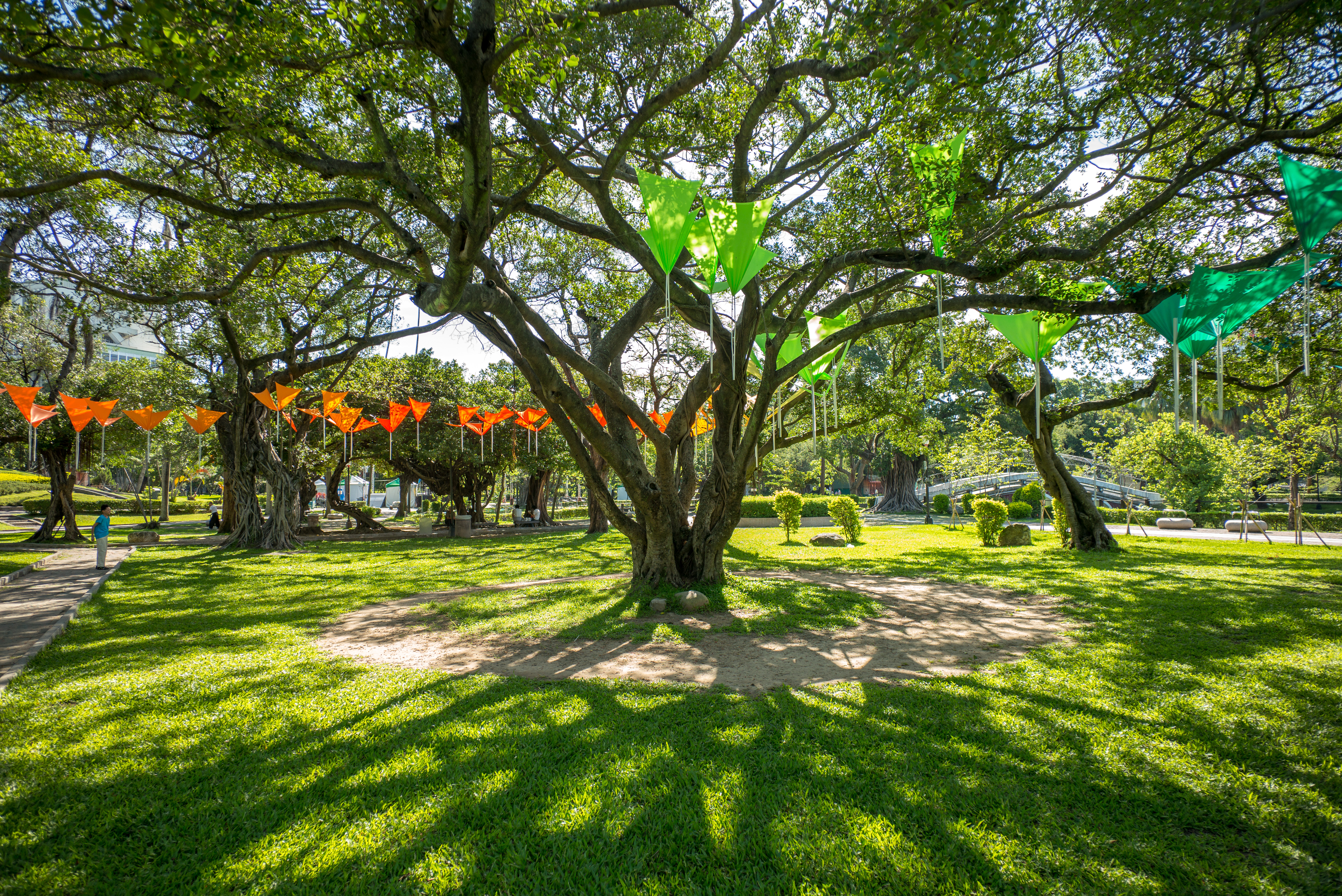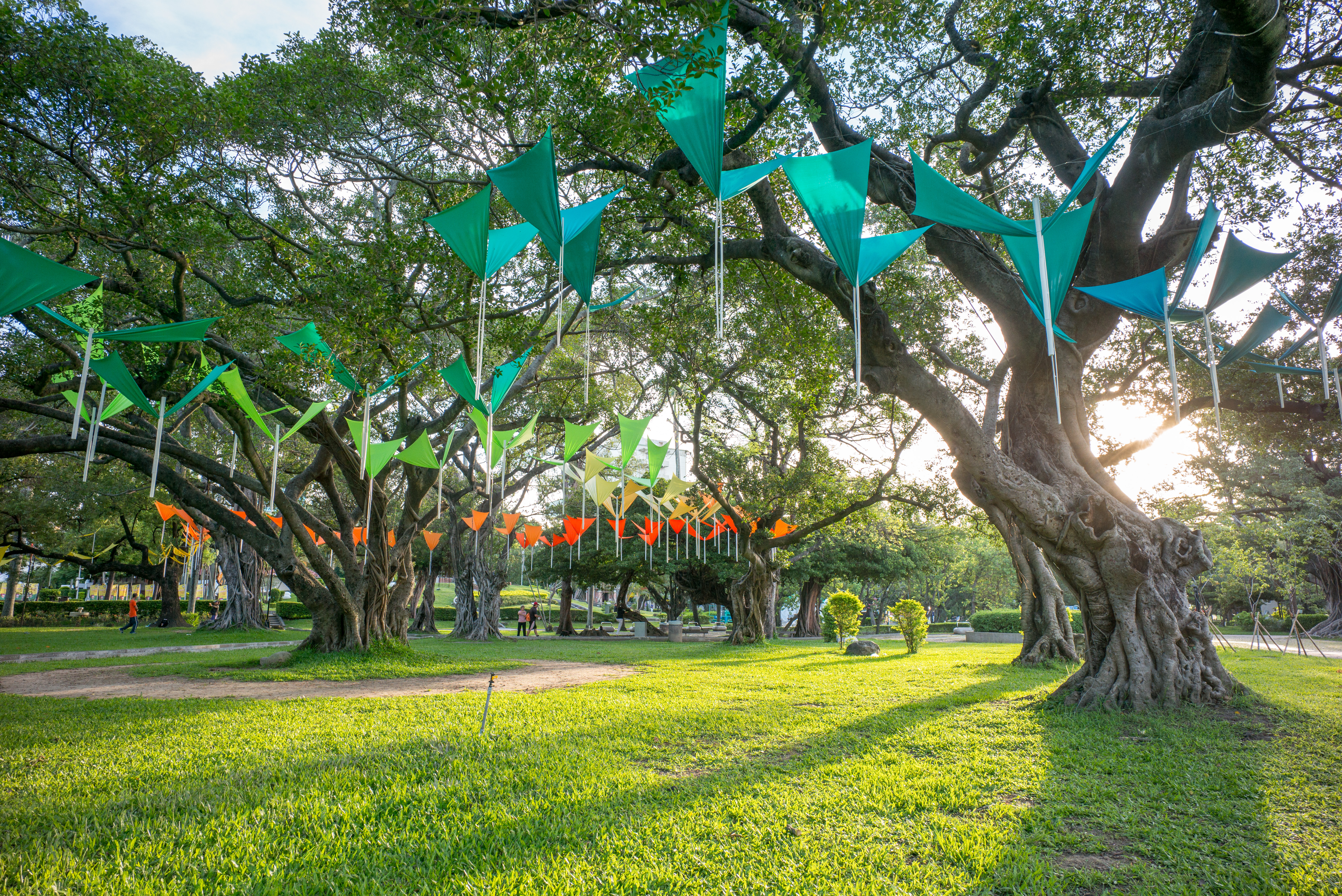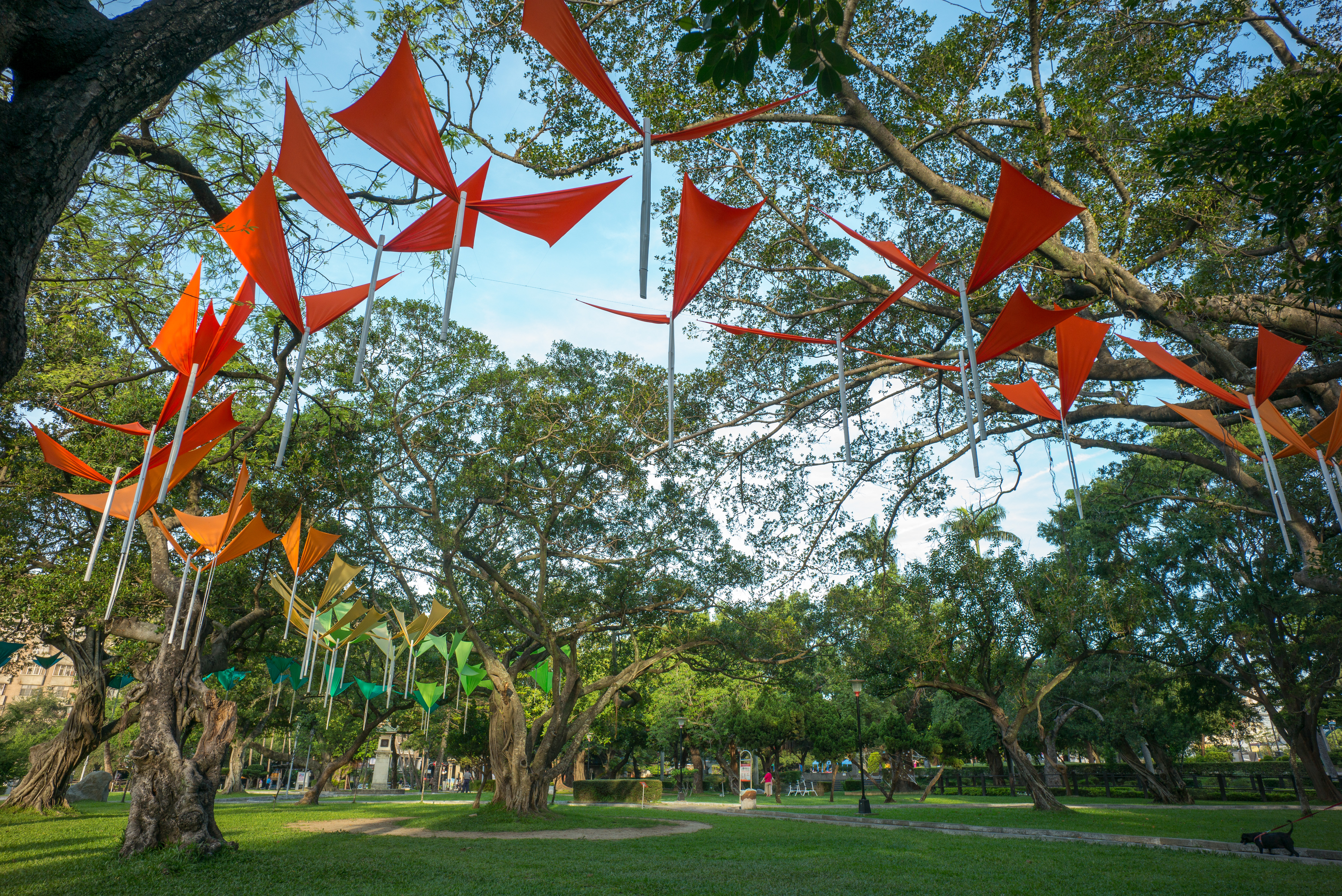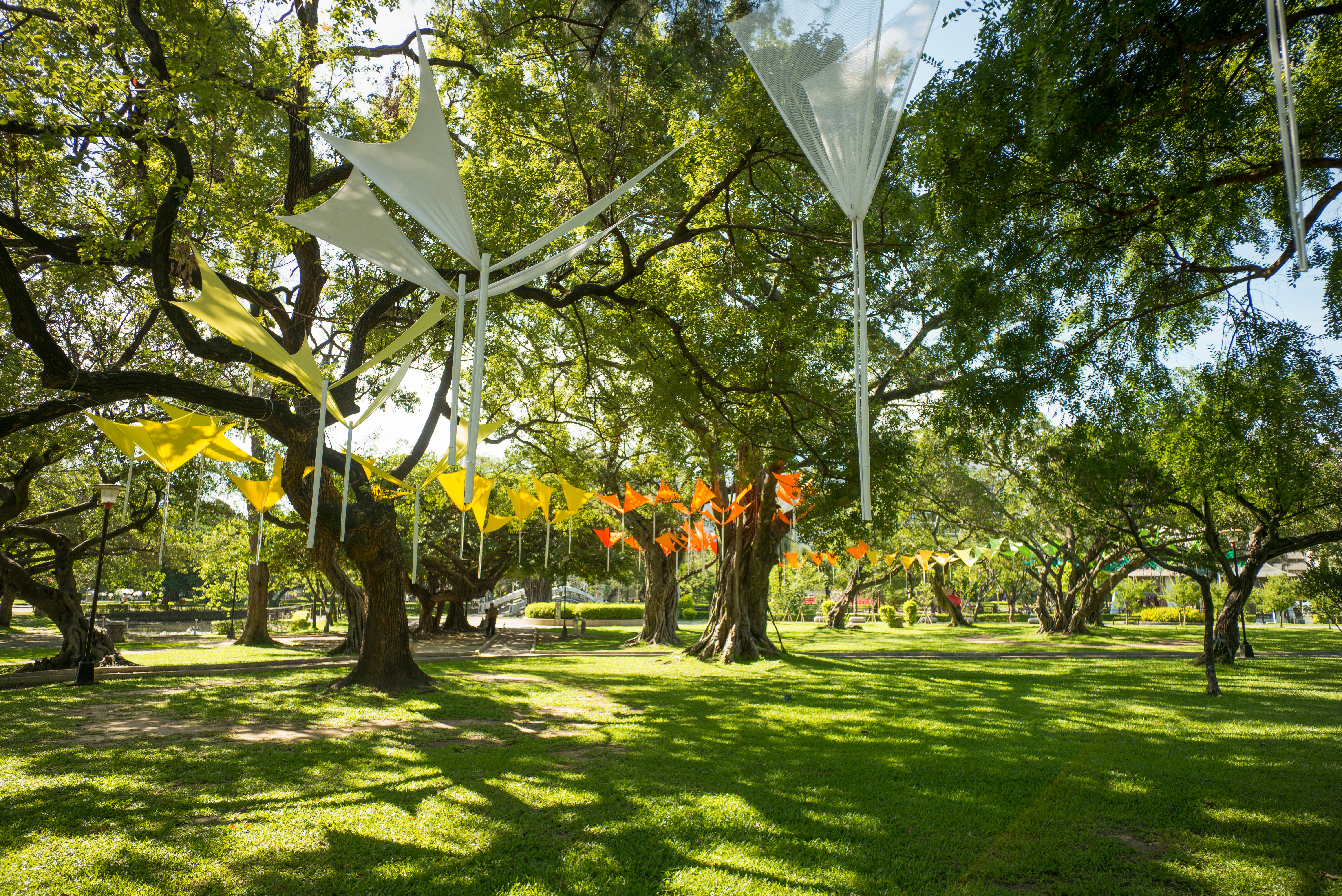 ""100"" equals completion without regrets; ""99"" equals long stretches without a break; ""1"" equals a beginning, a variable, and possibilities without end. 99 pieces of elastic cloth are paired with 99 bamboo poles, creating 99 images of flight. Hanging in twos and threes along the trees that line the park's catchwater channel, they stretch forth without pause. This