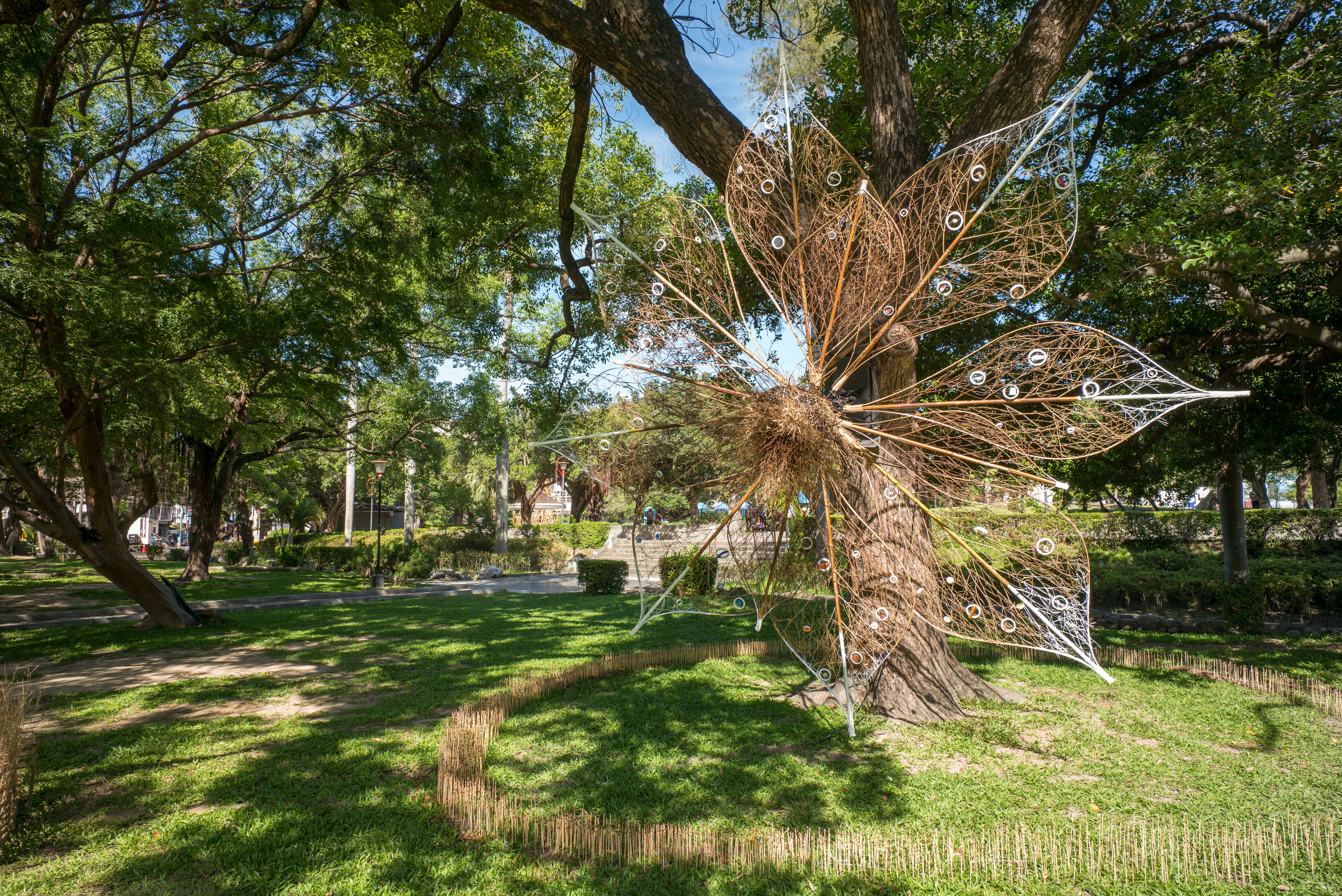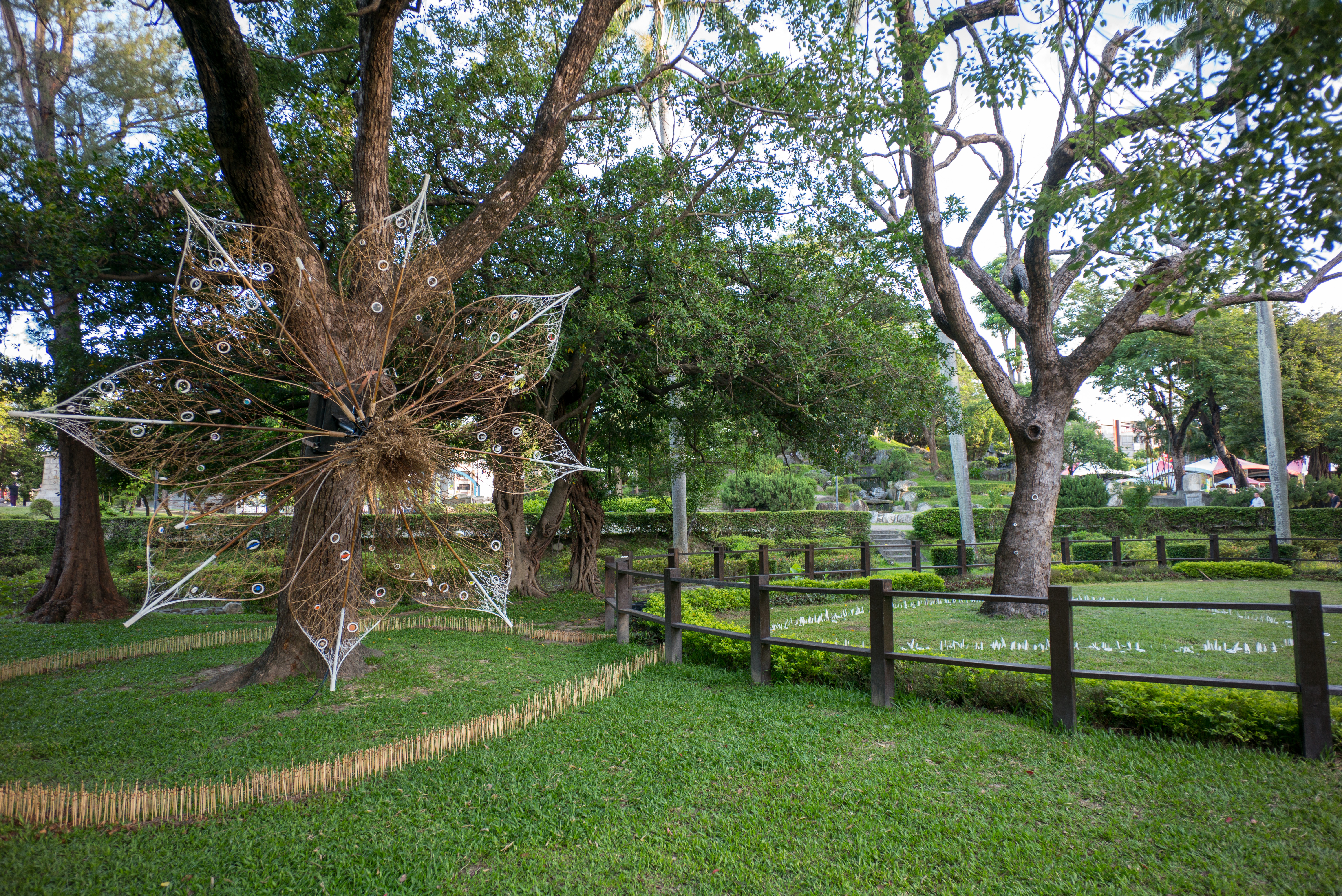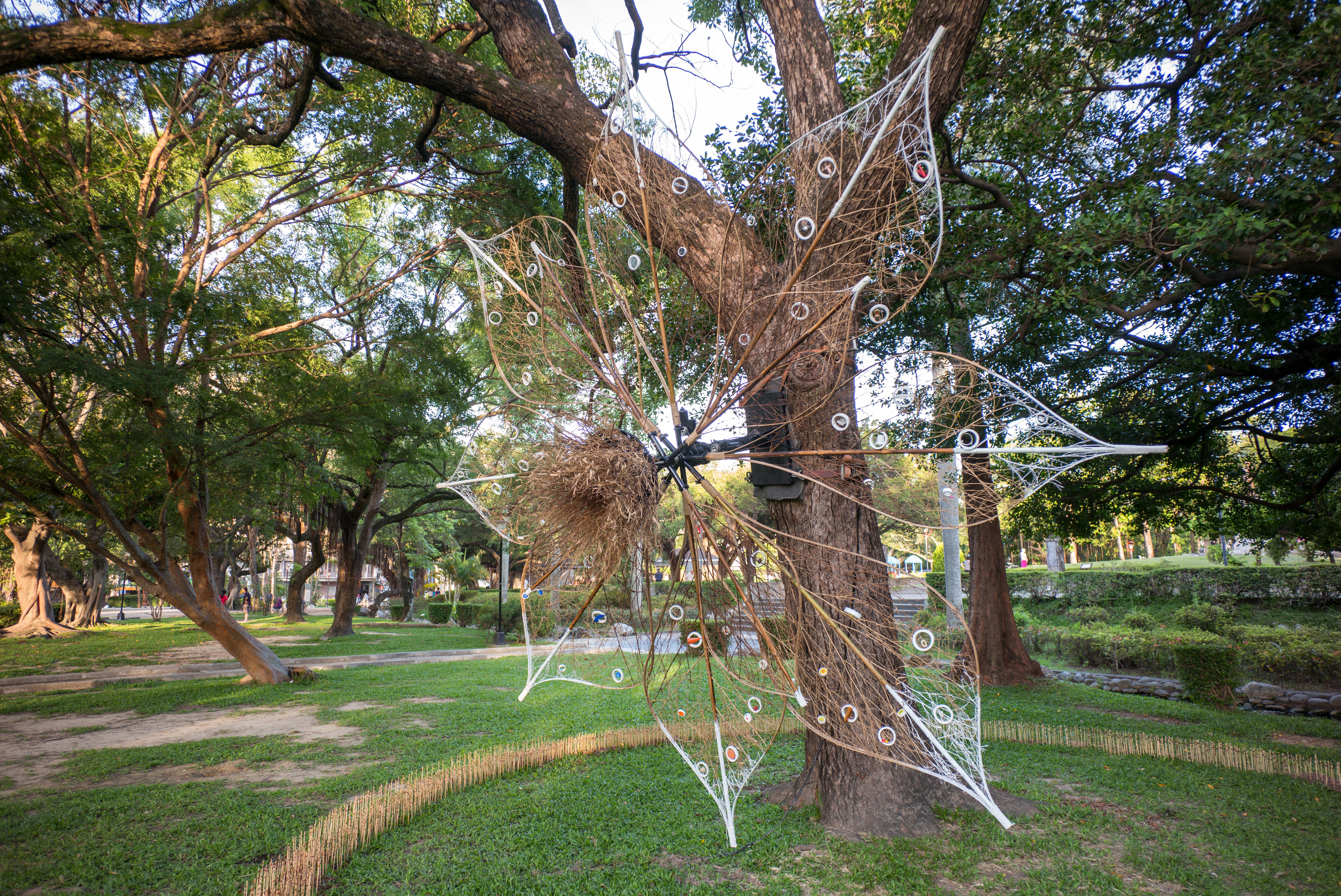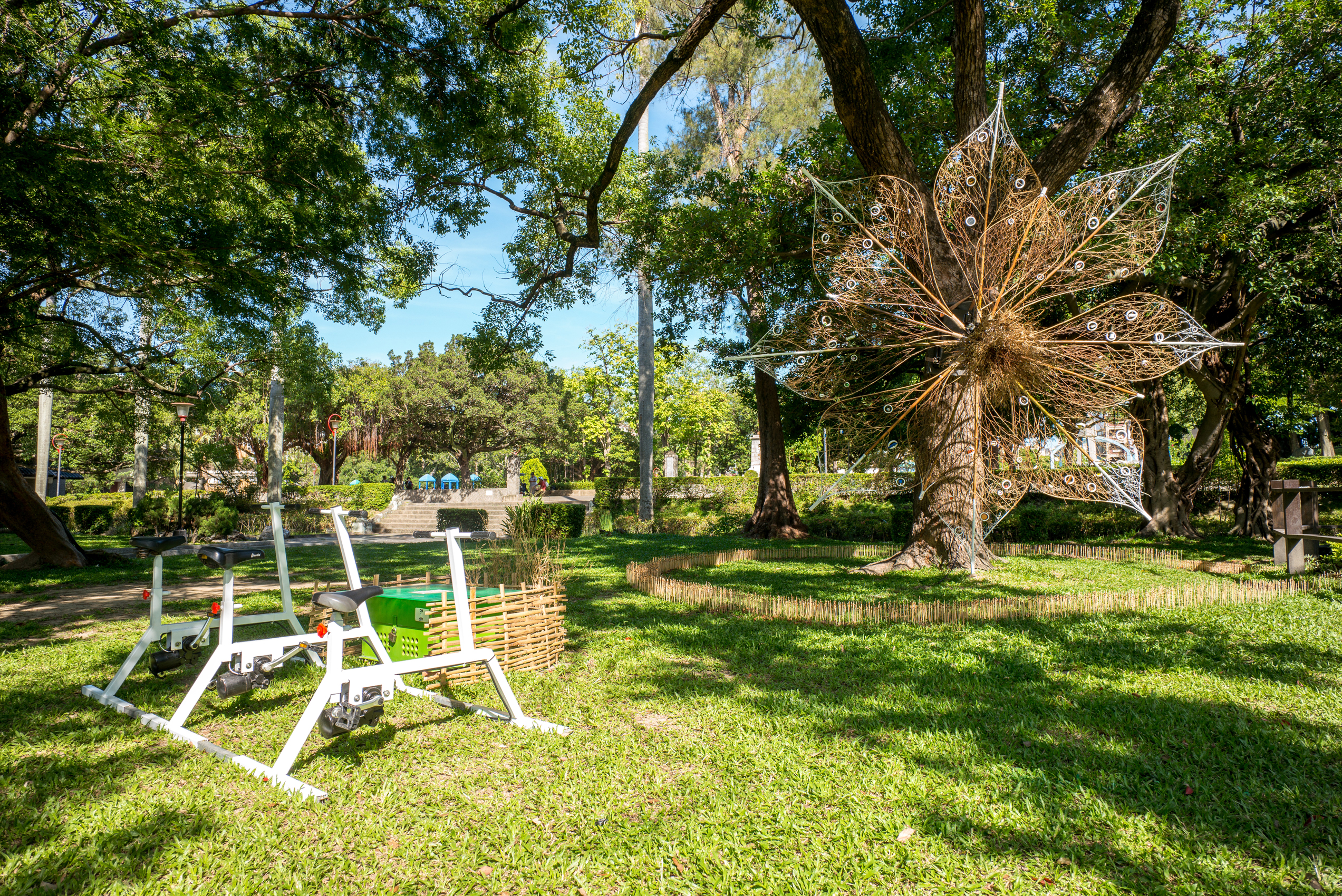 Light and electricity bring speed and convenience to our lives, behind them, however, lies habitual waste. Spend and Cherish is four steps of an endless cycle-spend, appreciate, praise, cherish. Installed on a tree trunk is an eight-bladed propeller, its colors arising from the discarded items found by the artist in the park. Flowers and trees are living things, yet objects and things can share that same life. In other words, a revisiting of the role of resources in our lives, under art's skillful touch, can imbue even ordinary objects with a bright radiance, while opening the flower that is Spend and Cherish.