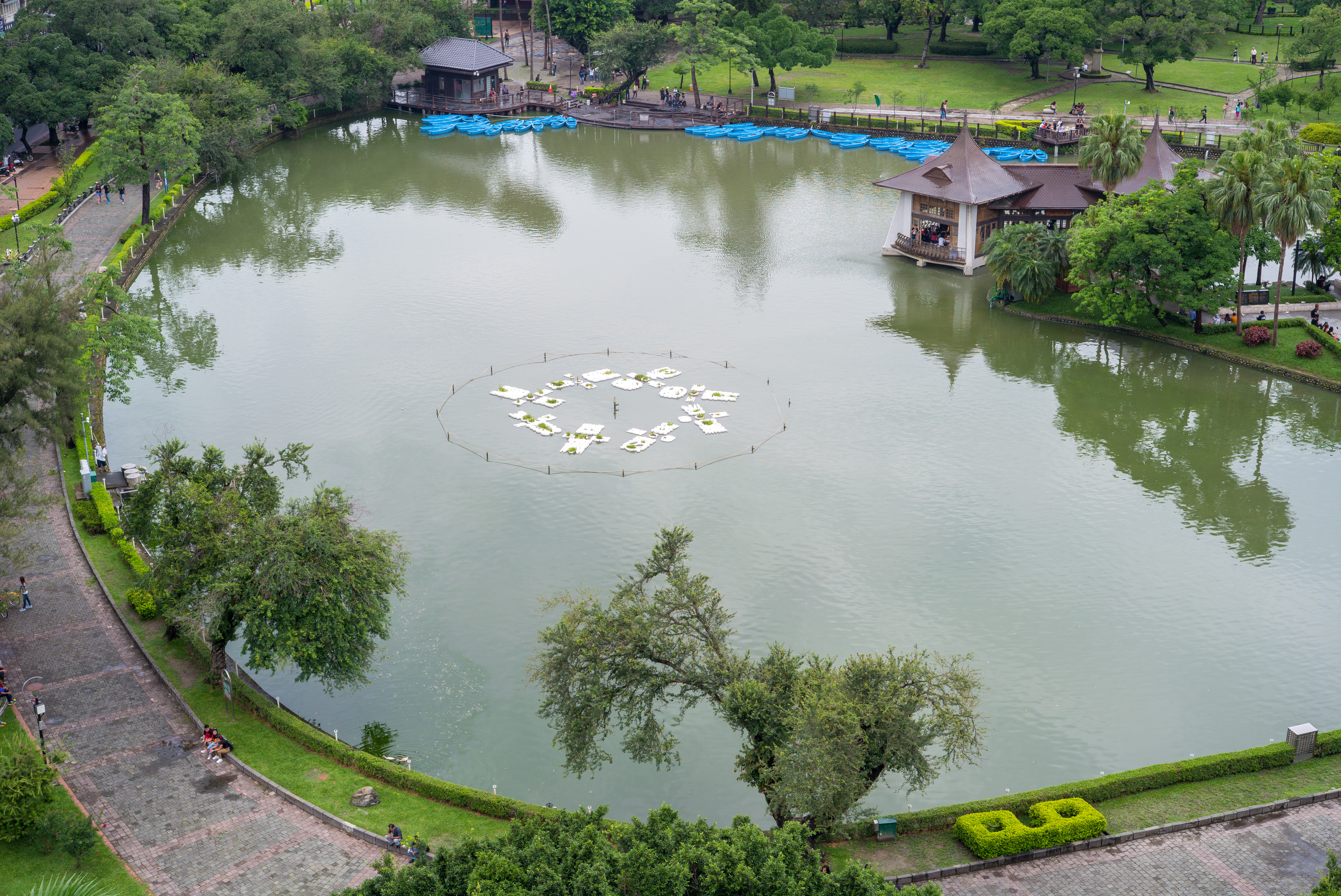 Here cutting means reducing: getting rid of excess or unwanted parts in a personal creative act. For the artist, it means creating a new meaning of life through a destructive ceremony. The work's aquatic design is a continuation of the artist's previous creations. The figure of a water fairy has been turned into an environmental installation through the use of waterproof and buoyant materials. The work can be viewed from the lake's paddle boats, where it offers a chance for spiritual transformation in the face of a completely new visual experience. Conversely, visitors can view the work from shore and take in the beauty of the water fairy and her environment as they merge into one.
