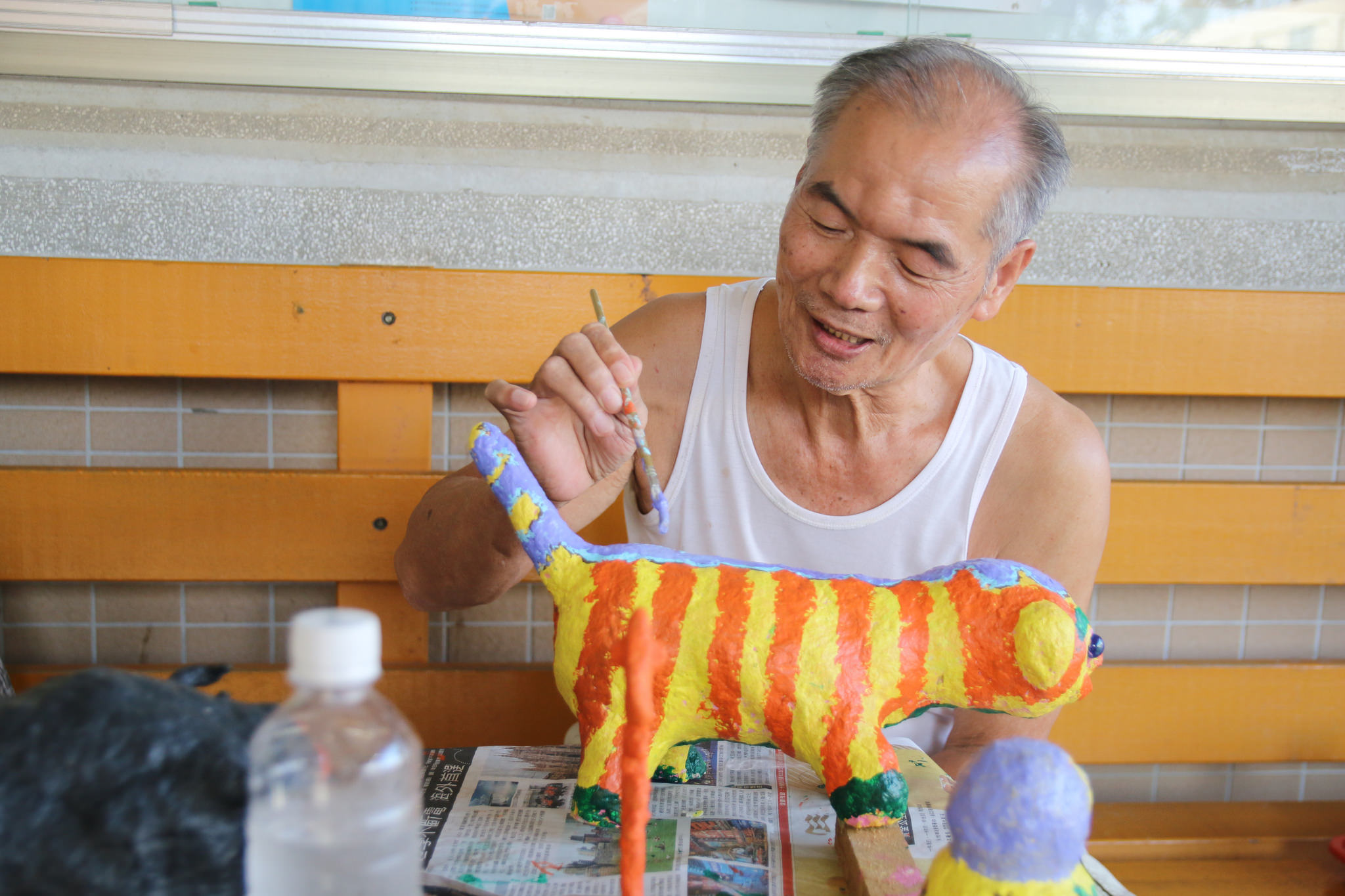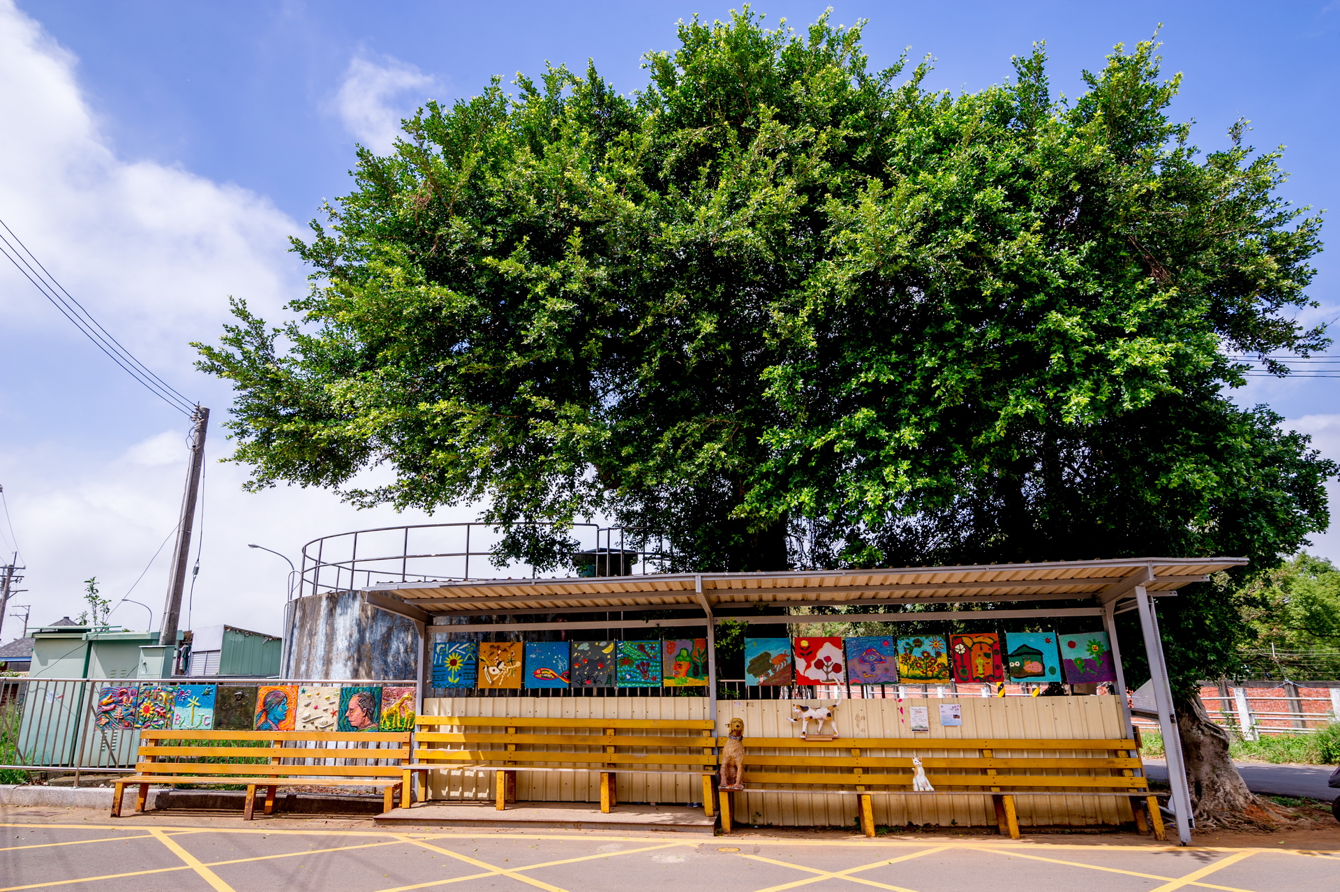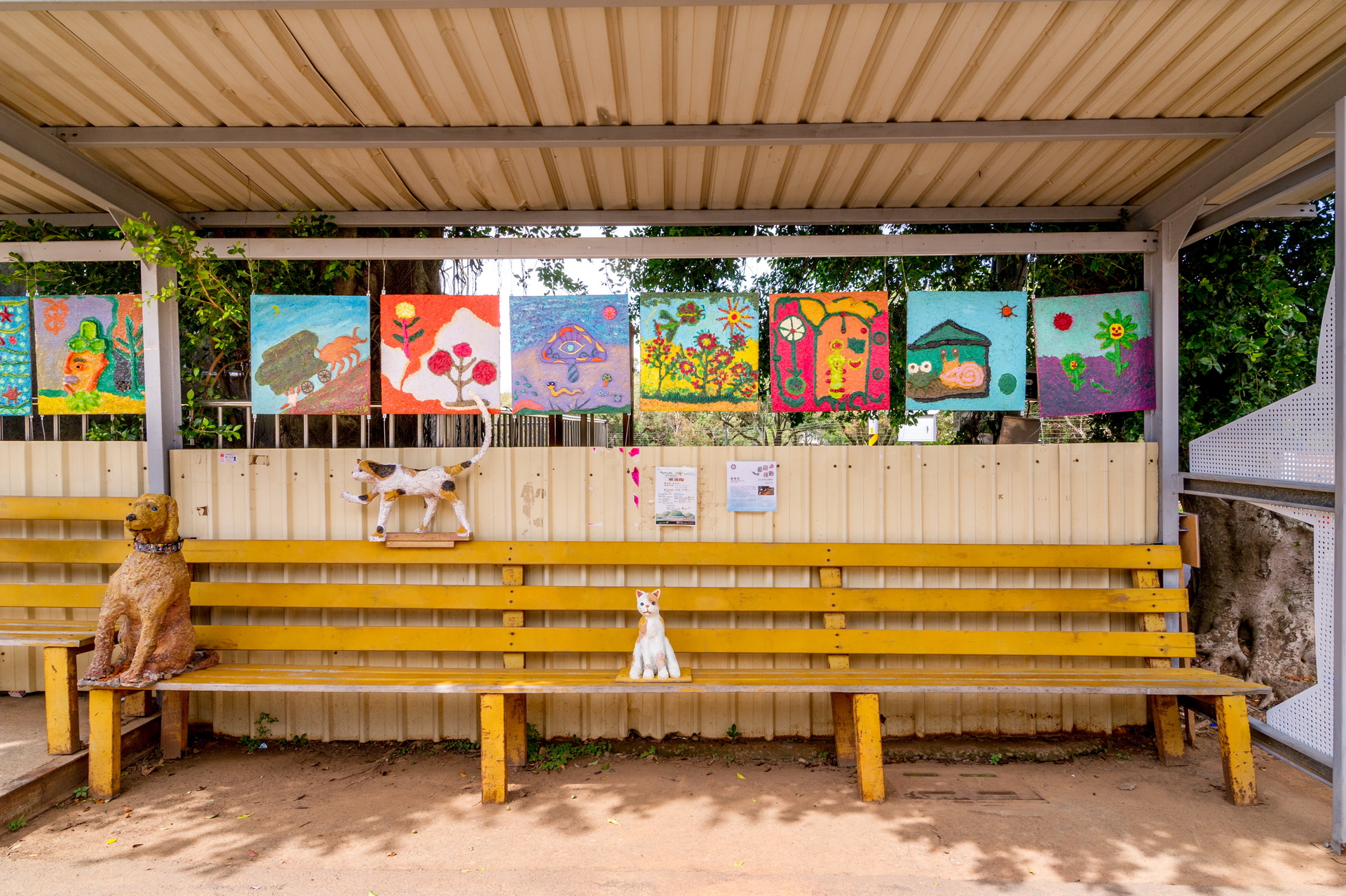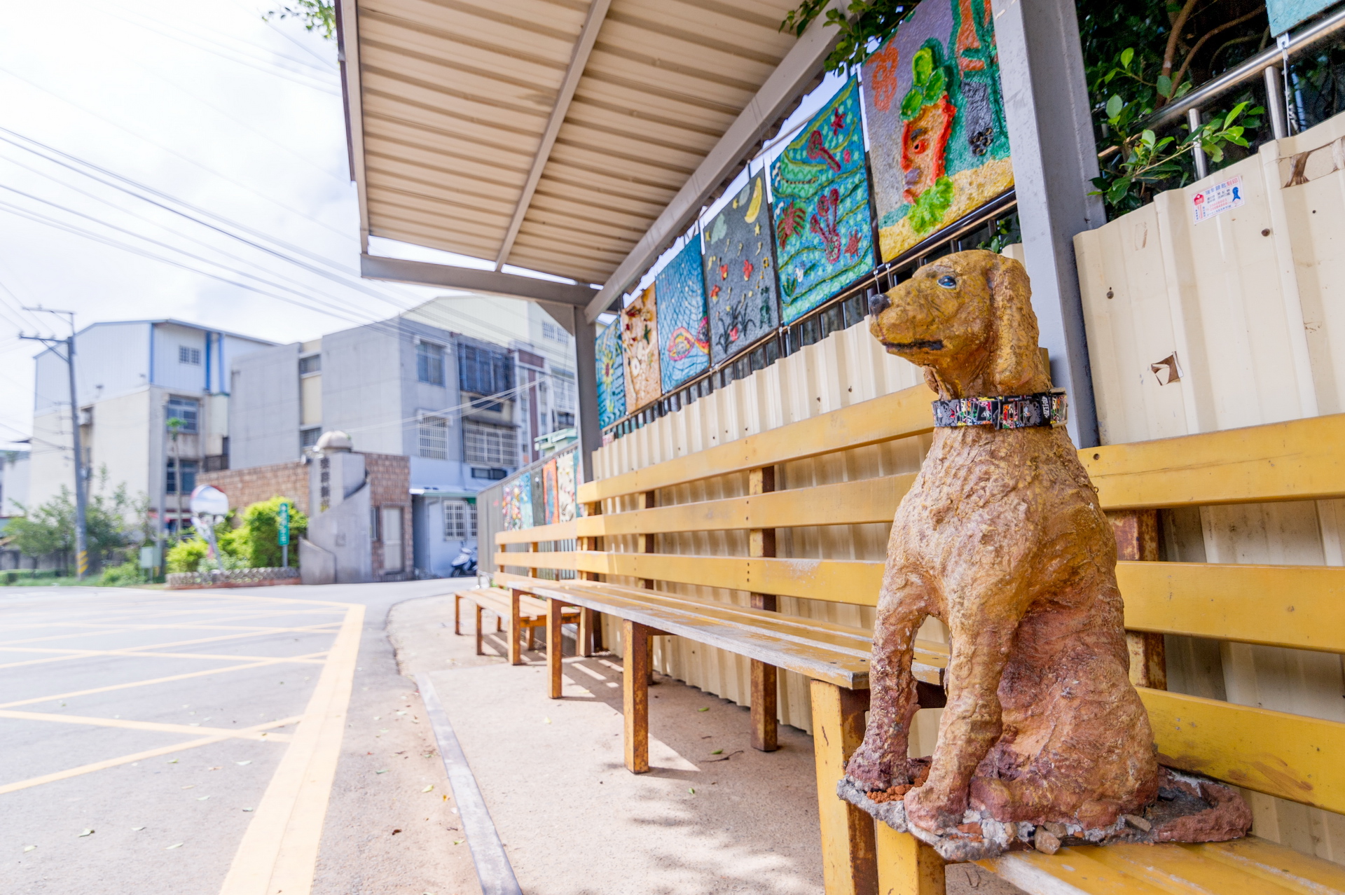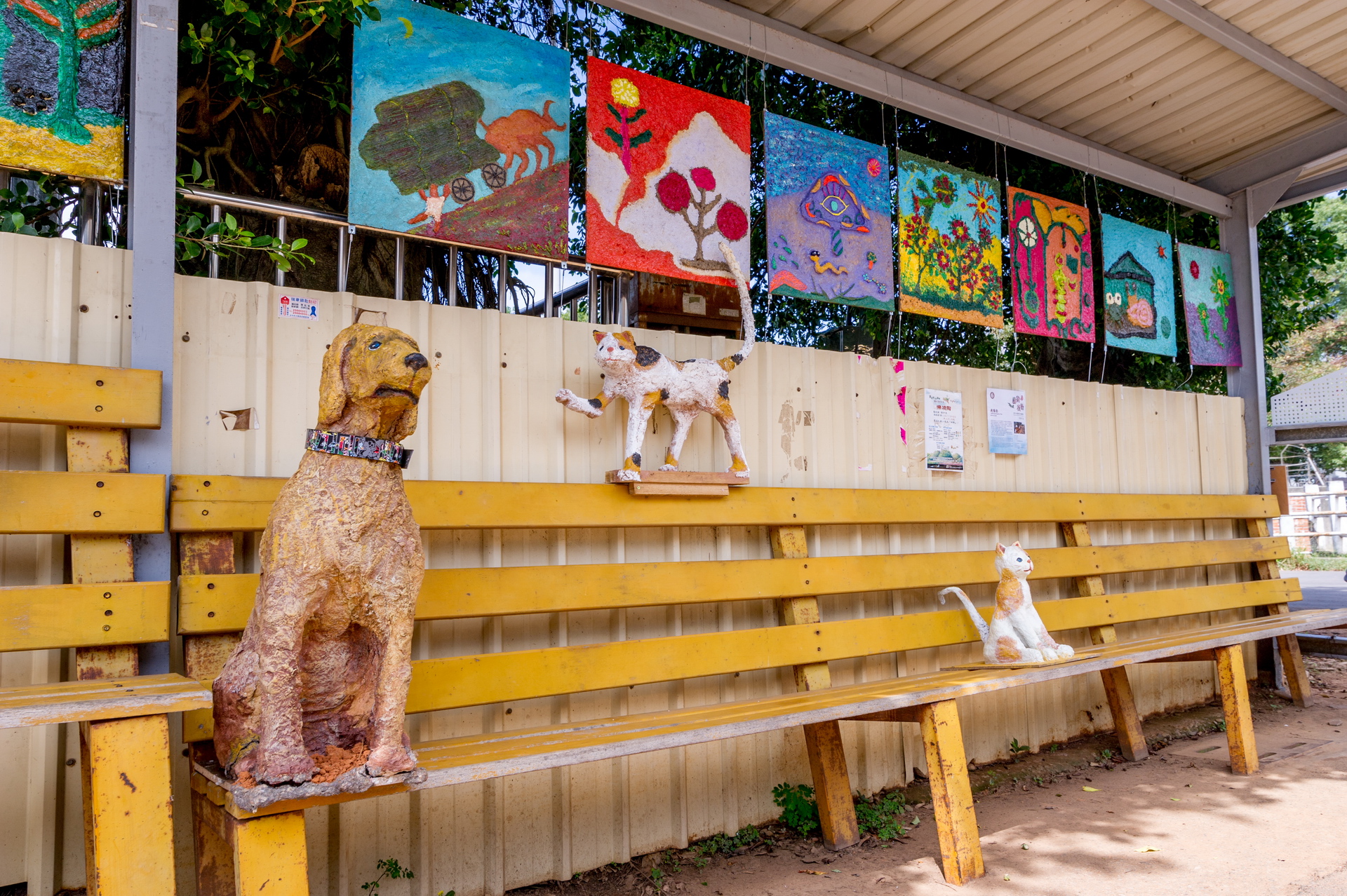 - 候車亭是社區内人來人往的中繼空間,透過藝術計劃得能量注人希望為社區候車亭增加一些溫馨的成分。在地的小貓小狗總是慵懶地走在這個安靜的社區,若在候車亭的位置做出一些動物造型的雕塑,可以讓這個候車亭多一點陪伴的氣氛。藝術家在社區現場進行創作,並且邀請有興趣的民眾一同參與。從在地的生活經驗進行發想,藝術家以紙漿雕塑的方式於社區内,做出可以安裝在社區候車亭的貓狗适型雕塑。